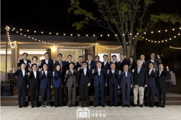 [singers news 씽어즈뉴스, 와보소기자] 윤석열 대통령은 9월 24일 저녁 국민의힘 지도부를 대통령실 앞 분수정원으로 초청해 야외에서 만찬을 가졌다. 대통령실과 국민의힘 지도부 만찬은 지난 7월 23일 전당대회 이후 새롭게 구성이 완료된 당 지도부를 처음으로 초청해 상견례와 함께 당 지도부를 격려하고 화합을 다지는 만찬이다.