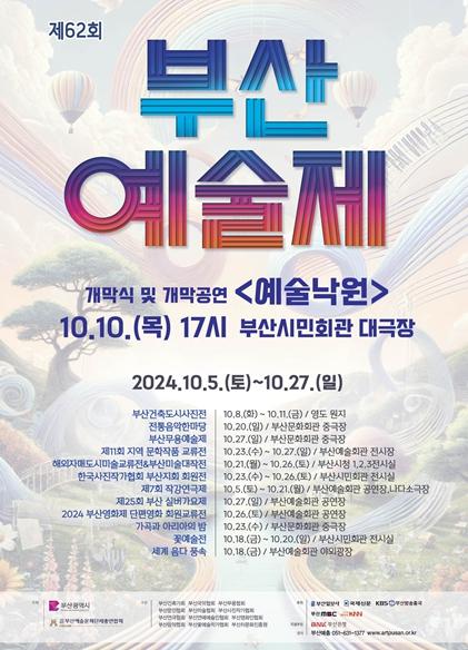 이날 개막식을 시작으로 본격적인 출발을 알리는 '제62회 부산예술제'는 오는 10월 27일까지 부산예술회관과 부산문화회관, 부산시민회관, 시청 일원에서 진행된다.