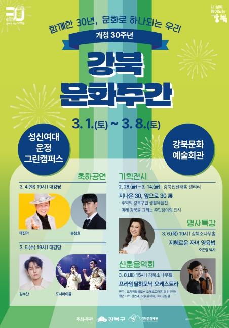 [singers news 씽어즈뉴스, 와보소기자] 서울 강북구는 개청 30주년을 기념하여 오는 3월 1일(토)부터 8일(토)까지 '강북 문화주간'을 운영한다고 밝혔다.