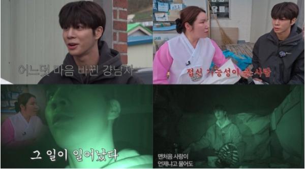 이어서 정동원은 ‘상남자 되기’ 미션으로 흉가의 신당 안에서 라면 끓여 먹기에 도전한다. “남잔데 라면 하나 정도는 끓여 먹어야 한다”며 컵라면과 보온병을 꺼내 즉석 라면을 준비했다.