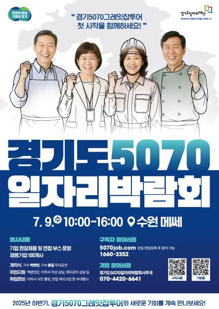 [singers news 씽어즈뉴스, 와보소기자] 경기도가 9일 수원메쎄에서 ‘2025 경기도 5070 일자리 박람회’를 개최한다. 이번 박람회를 시작으로 도는 하반기 중 도내 31개 시군을 순회하는 ‘경기 5070 그레잇잡투어(Gray it-job tour)’를 추진한다.