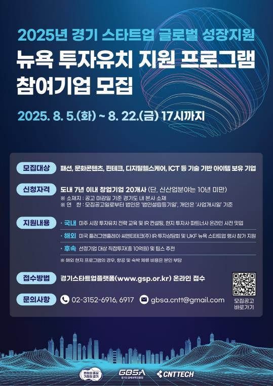 [singers news 씽어즈뉴스, 홍기한기자] 경기도와 경기도경제과학진흥원은 도내 스타트업의 미국 시장 진출을 위해 ‘2025년 경기 스타트업 글로벌 성장지원 뉴욕 투자유치 지원 프로그램’에 참여할 기업을 오는 22일까지 모집한다.