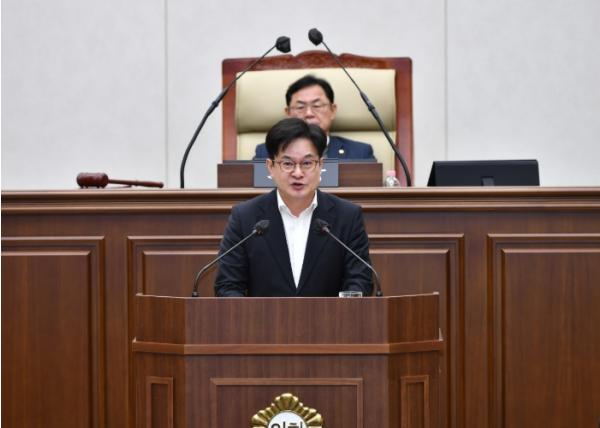 [singers news 씽어즈뉴스, 홍기한기자] 김병수 김포시장이 1일 김포시의회 제264회 임시회에서 ‘2026년도 예산안 제출에 즈음한 시정연설’을 통해 “시민이 상상하는 내일, 김포가 현실로 만든다. 성과로 증명하고 비전으로 미래를 열겠다”고 각오를 밝히며 2026년 민선8기 4년차 시정이 ‘교통’, ‘수변문화’, ‘야간정책’, ‘새롭게 꿈꾸는 교육’이라는 4대 핵심 키워드를 중심으로 ‘통하는 70도시 우리김포’를 완성하기 위해 모든 역량을 집중하겠다고 전했다.