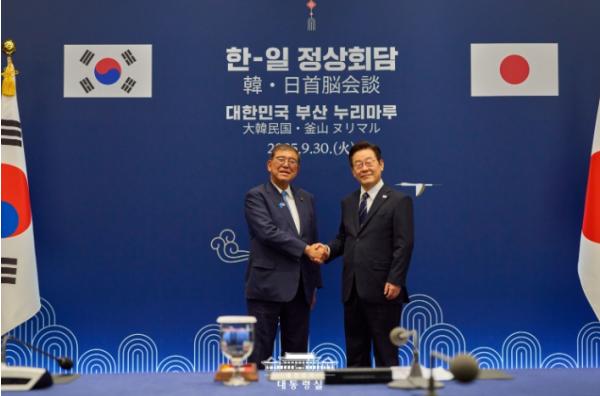 [singers news 씽어즈뉴스, 홍기한기자] 이재명 대통령은 9월 30일 '이시바 시게루(石破 茂)' 일본 총리와 부산에서 한일 정상회담을 가졌다. 양 정상은 한일 간 실질 협력 강화 방안과 지역 및 글로벌 차원에서의 협력 필요성에 대해 폭넓고 심도 깊은 의견을 교환했다.