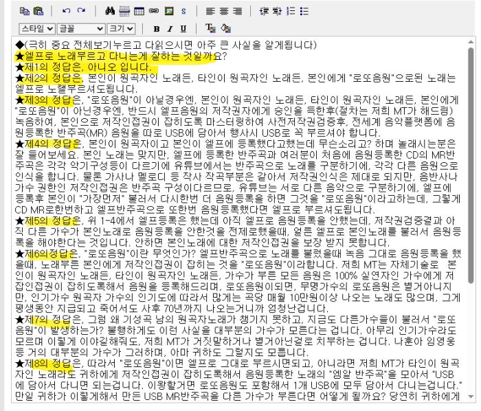 ★제8의 정답은, 따라서 "로또음원"이면 엘프로 그대로 부르시면되고, 아니라면 저희 MT가 타인이 원곡자인 노래라도 귀하에게 저작인접권이 잡히도록해서 음원등록한 노래의 "엠알 반주곡"을 모아서 "USB에 담아서 다니면 되는겁니다. 이왕할거면 로또음원도 포함해서 1개 USB에 모두 담아서 다니는겁니다." 만일 귀하가 이렇게해서 만든 USB MR반주곡을 다른 가수가 부른다면 어떻게 될까요? 당연히 귀하에게 저작인접권이 잡히는겁니다.