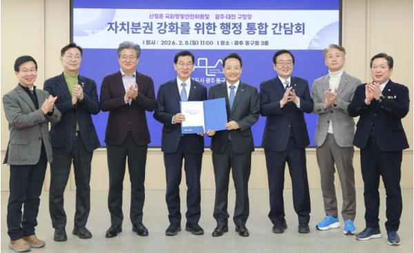 대전 정용래 유성구청장·김제선 중구청장과 광주 5개 구청장은 8일 오전 광주 동구청에서 자치분권 강화를 위한 행정통합 간담회를 갖고, 통합특별법안 심의 과정 중 반영되어야 할 핵심 과제를 촉구하는 공동건의문을 채택했다.