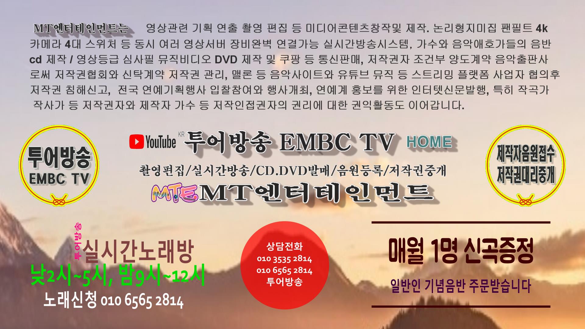 투어방송 EMBCTV (구, 님아뮤직)는 Music의 M과 Tour의 T 그리고 Entertainment 를 뜻하는 '엠티엔터메인먼트(MT ENTERTAINMENT)' 소속 유튜브채널이름입니다. 2008년 4월 '님아뮤직'이라는 세이캐스트 라디오방송을 1인 방송으로출발하여, 2011년 11월 유튜브 플랫폼에 뮤직투어라는 채널을 만든후 2015년11월에 영상방송개국하고 주로 가수들의 노래를 주제로한 영상화 작업에 치중했으며, 2022년 6월부터는 콘서트 공연 활성화하여 1회 공연에 150명 이상의 가수가 참여하는등 많은발전에 힘입어, 이제 저작권관련 업을 위해 문화체육부 관련기관과 국세청 등에 저작권과 관련된 필요한 모든 사항을 검토하여 각부문별 신고 면허 등록 등의 합법적 절차를 거쳐 2023년 부터 새로운 영역으로사업을 확대한다.