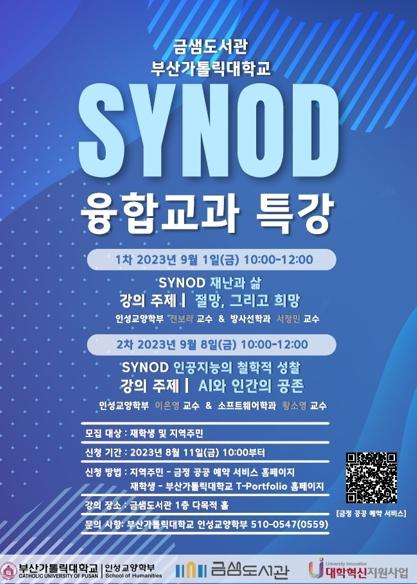 시노드 특강 프로그램은 총 2회로 진행되며 9월 1일 1차시는 재난이 우리의 삶에 미치는 영향에 대한 주제 특강으로 부산가톨릭대학교 전보라·서정민 교수가 강의하고, 9월 8일 2차시는 인공지능 기술의 수용과 발전에 관한 주제 특강으로 부산가톨릭대학교 이은영·황소영 교수가 강의를 담당할 예정이다.