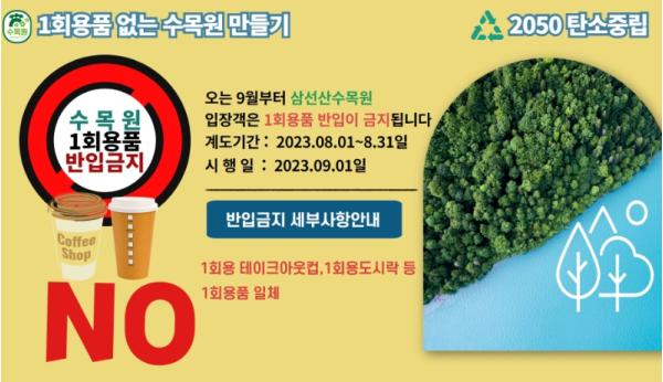한편 삼선산수목원은 1회용품 반입 금지 결정에 대한 혼란을 최소화하기 위해 8월 한 달을 계도기간으로 정해 운영하고 있다.