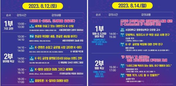 1부에서 K-영화·드라마 분야 특강으로는 드라마 ‘모범택시’와 ‘범죄도시 4’ 각본을 쓴 오상호 작가와 영화 ‘베테랑’, ‘써니’ 중국판을 제작한 황본 애드마크스튜디오 본부장이 K-콘텐츠의 IP(지적재산권) 확장전략 포럼을 진행한다.