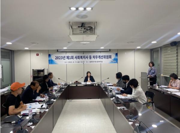 충청북도 사회복지사 등 처우개선위원회는 올해 처음 구성되어 보건복지국장, 양성평등가족정책관, 김규림 복지와 나눔실천연구소 소장을 비롯한 총 10명이 참여하여 임기 2년 동안 사회복지시설 종사자의 처우개선을 위한 사항을 자문·심의하는 위원회이다.