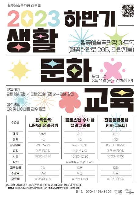 시흥시가 월곶예술공판장 아트독에서 ‘2023년 생활문화 활성화 사업’ 일환으로 다양한 하반기 생활문화 프로그램을 운영, 참여자를 모집한다.