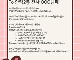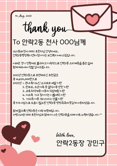 동래구 안락2동은 지난 10일 나눔으로 이웃사랑을 실천하고 있는 [우리동래 천사사업] 후원자 176명에게 감사 서한문을 발송했다고 밝혔다.
