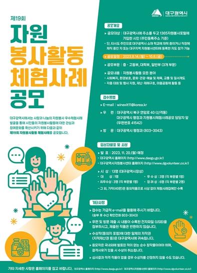 대구광역시는 사랑과 나눔을 실천하는 자원봉사활동 우수체험사례 발굴 및 시상을 통해 자원봉사 참여문화를 확산하기 위한 ‘제19회 대구 자원봉사활동 체험사례’를 공모한다.