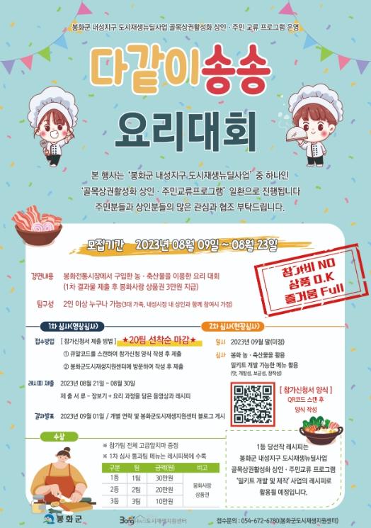 봉화군은 23일까지 봉화 내성지구 도시재생 뉴딜사업 골목상권활성화 상인?주민교류 프로그램 운영의 일환으로 진행되는 ‘다같이 송송 요리경연대회’ 참가자를 모집한다.