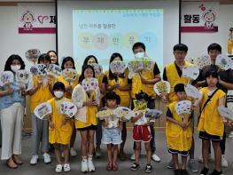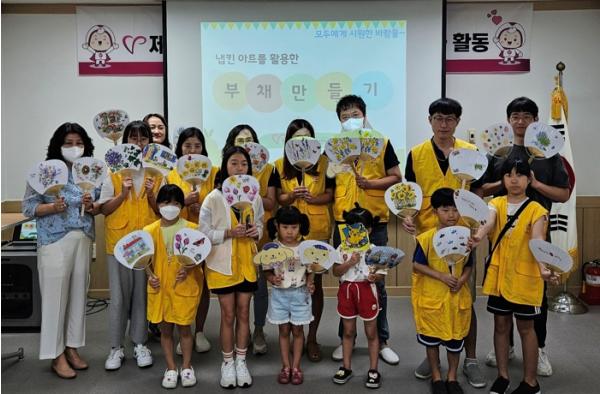 ‘더워도, 시원하군, 나누면!’이라는 슬로건 아래 실시된 가족봉사단의 이번 8월 활동 프로그램에서는 단원들이 냅킨 아트지를 이용해 직접 만든 부채를 주변의 어르신들에게 나눠주며 봉사의 의미를 되새겼다.