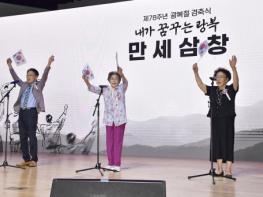 제78주년 광복절을 맞은 15일 오전 10시50분. 경축식이 열린 광주광역시청 대회의실 가득 만세삼창이 울려퍼졌다. 이번 만세삼창의 선두에는 최만년 애국지사 손자녀인 최장훈 선생, 일제강제동원 피해자 양금덕 할머니, 김범수 독립유공자 손자녀인 김행자 선생이 함께 섰다.