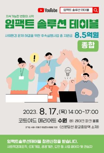 경기도사회적경제원이 종합 임팩트 솔루션 테이블 행사를 17일 14시에 사업 참여자와 관심자 100명 대상으로 코트야드 메리어트 수원에서 개최한다.