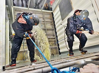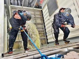 훈련에 참가한 해양경찰과 해군의 구조대원들은 가상 사고 선박에서 빠른 속도로 유출되는 기름을 막기 위해 파공된 부분을 신속하게 봉쇄하는 연습을 실시했다.
