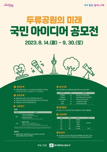 대구광역시 달서구는 대구의 보물인‘두류공원’의 가치를 널리 알리는 한편, 대구를 대표하는 글로벌 랜드마크로 조성하기 위한 방안을 모색하고자 2023년 8월 14일부터 9월 30일까지 '두류공원의 미래'국민 아이디어 공모전을 개최한다.