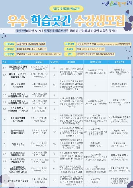 올해는 우수학습곳간 9개소에 총 13개의 프로그램을 9월부터 운영하며, 8월 22일부터 8월 25일까지 금정구 평생학습 포털 누리집을 통해 온라인으로 신청하면 된다.