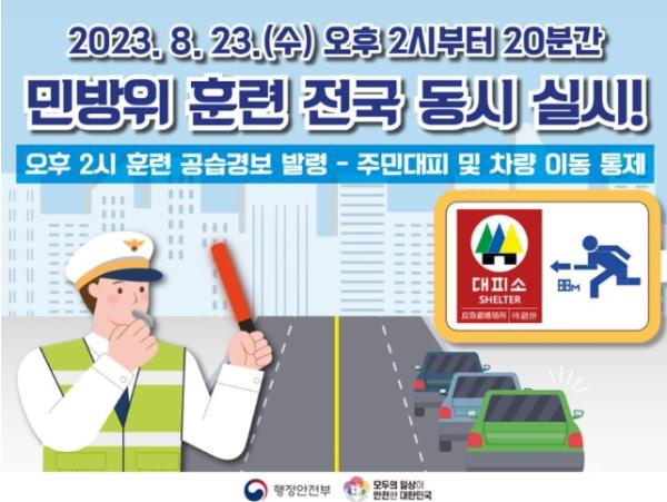 제천시는 적 공습에 대한 국민 대응 역량을 강화하기 위해 오는 23일 오후 2시부터 20분간 공습 대비 민방공 대피훈련을 실시한다고 밝혔다.