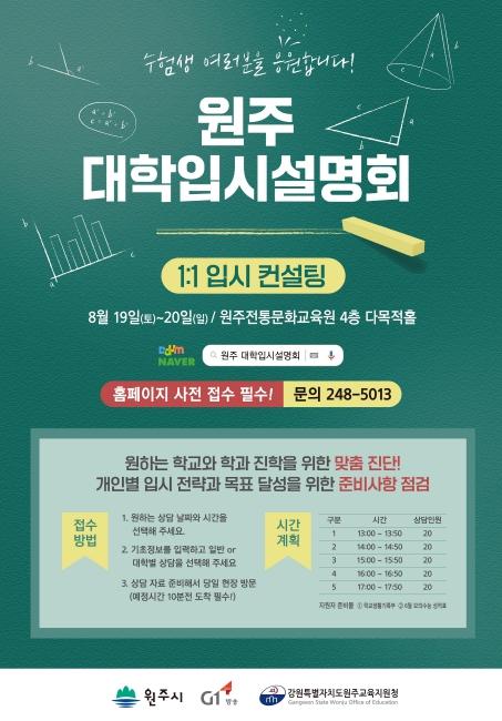 G1방송, 원주교육지원청과 함께하는 이번 입시설명회는 8월 19일부터 20일까지 원주전통문화교육원 4층 다목적홀에서 열린다.