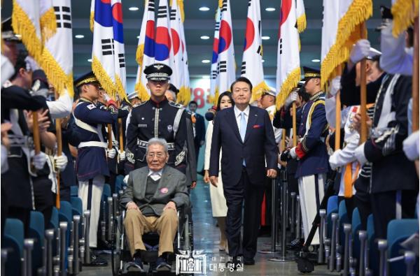 한편, 대통령 부부는 경축식장에 미리 도착해 오성규 애국지사와 김영관 애국지사를 직접 맞이하고 행사장에 함께 입장하며 독립운동에 헌신한 애국지사분들에게 최대한 예우를 표했다.