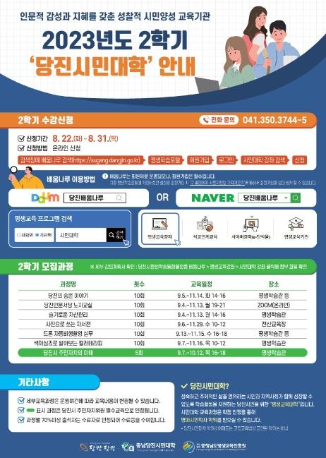 당진시가 9월부터 11월까지 진행되는 충남당진시민대학 2학기의 수강생을 8월 31일까지 모집한다.