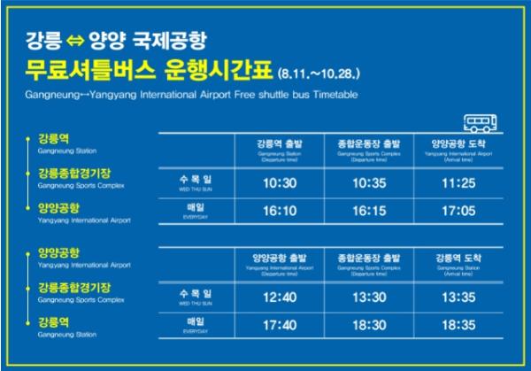 KTX 강릉역에서 강릉종합운동장을 경유하여 양양국제공항을 오가는 노선으로 운영되며 당일 선착순으로 탑승 가능하고 자세한 사항은 강릉시청 홈페이지 공지사항에서 확인할 수 있다.
