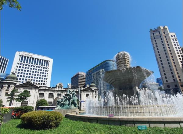 한여름 막바지 더위가 한창인 가운데 서울 중구가 지난 11일 한국은행 분수대의 정비를 완료했다고 밝혔다. 현재 분수대는 이미 가동을 시작해 시원하게 물줄기를 뿜어내며 오가는 행인들의 더위를 식혀주고 있다. 지난해 안전상의 문제로 작동이 일시 중단된 후 1년여 만이다.