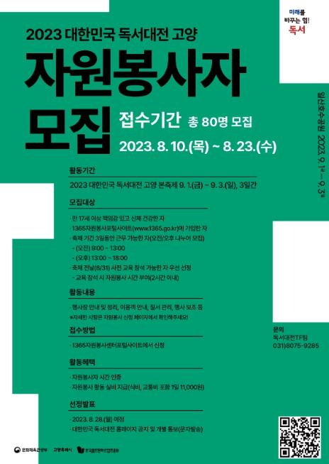 고양특례시가 ‘2023 대한민국 독서대전 고양’ 본 행사를 지원할 자원봉사자를 모집한다. 자원봉사자는 행사 기간 동안 프로그램 준비와 안내, 질서 유지 및 환경 관리 등 행사장 곳곳에서 원활한 행사 진행을 돕는다.
