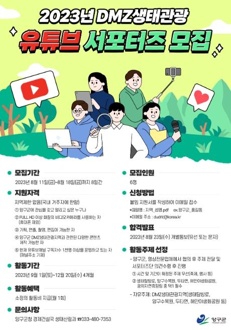 양구군은 양구군 DMZ 생태관광을 홍보할 유튜브 서포터즈 6명을 모집한다.