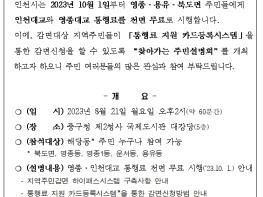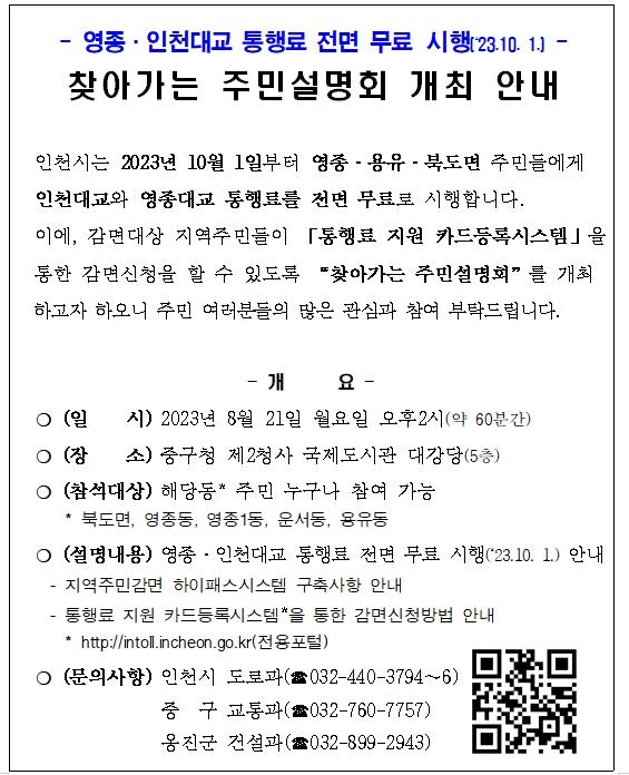 인천광역시는 오는 10월 1일 영종·용유지역과 옹진군 북도면 거주 주민들에 대한 영종·인천대교 통행료 전면 무료 시행에 앞서, 8월 21일 오후 2시부터 중구청 제2청사 대강당에서 ‘찾아가는 주민설명회’를 개최한다고 밝혔다.