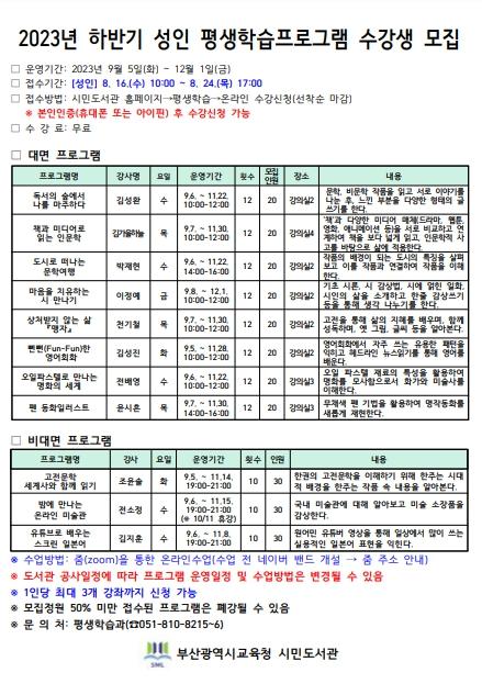 부산광역시립시민도서관(관장 천정숙)은 9월 5일부터 12월 1일까지 유아, 초등학생, 성인을 위한 21개 평생학습 프로그램을 운영한다.
