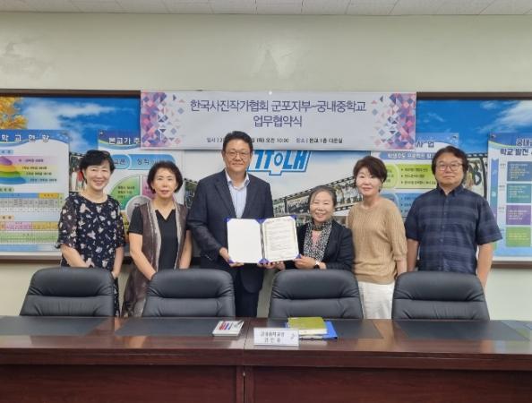 궁내중학교는 지난 7월 25일 (사)한국사진작가협회 군포지부(지부장 임효례)와 업무협약을 체결하고, 군포지부 회원들의 사진을 6개월에 한 번씩 무상 임대하는 방식으로 제공받아 사진관을 개관하게 됐다.