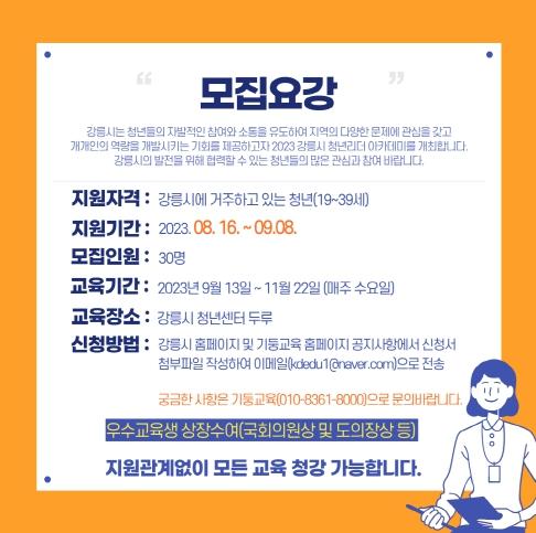 강릉시는 청년들의 역량 강화와 자립을 도모하여 강릉의 미래를 이끌어 갈 ‘2023 강릉시 청년 리더 아카데미’ 참여자를 오는 9월 8일까지 모집한다.