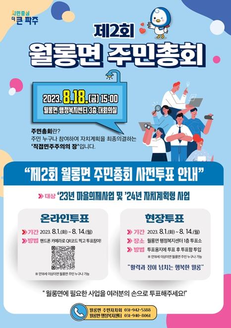제2회 파주 월롱면 주민총회가 오는 18일 월롱면 행정복지센터 3층 대회의실에서 개최된다.