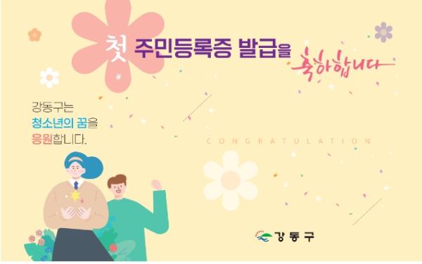 강동구가 올 하반기에 생애 첫 주민등록증을 발급 받는 17세 청소년을 대상으로 축하와 응원 메시지를 담은 카드를 함께 전달하는 사업을 추진한다고 밝혔다.