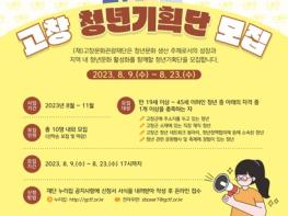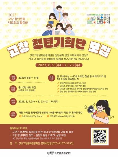 고창문화관광재단이 지역 내 청년들의 성장과 청년문화 활성화를 위해‘고창 청년기획단’을 8월 23일까지 온라인 접수로 모집한다.