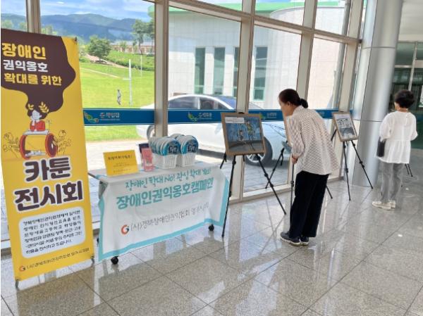 전시품은 총 18점이며 장애인에 대한 정책, 편견, 고용, 편의시설, 차별 등을 주제로 장애인 인식개선 교육을 받은 예술 고등학교 학생들이 그린 카툰 작품이다.