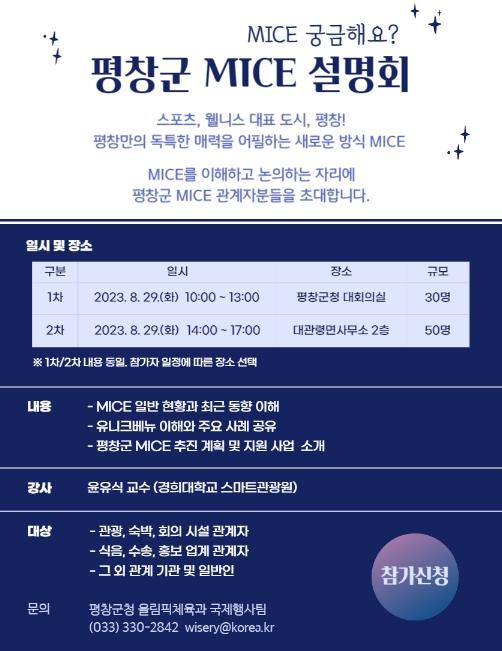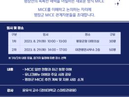 이번 설명회는 연구 용역의 일환으로 지역의 MICE 관계자들에게 MICE 현황과 최근 산업 동향, 유니크베뉴와 주요 사례, 평창군 MICE 추진 계획과 지원 사업을 소개할 예정이다.