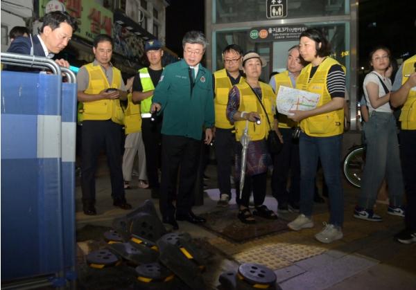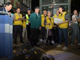 우선 재개발이 이뤄지고 있는 세운지구 공사장 현장을 점검했다. 김길성 구청장은 주민 불편을 초래하는 공사장 야간 소음이 발생하지는 않는지, 인도 및 이면 도로에 공사 적치물이 있어 통행에 불편을 주거나 위험하지는 않은지 골목을 걸으며 꼼꼼히 확인했다. 또, 유동 인구가 많은 을지로 3가 일대는 인근 상가의 불법 적치물과 쓰레기 무단투기로 인해 거리 안전 및 환경 문제는 없는지 살폈다.