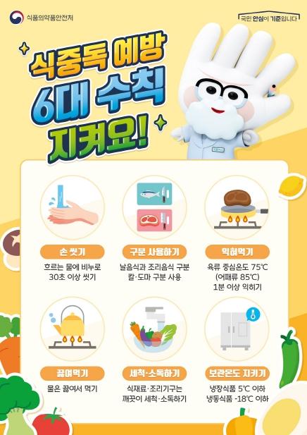 식중독 예방 6대 수칙은 ▲흐르는 물에 30초 이상 손 씻기 ▲날음식과 조리 음식용 칼 및 도마 구분 사용하기 ▲음식물 중심 온도 85℃ 이상, 1분 이상 익혀 먹기 ▲물은 끓여서 먹기 ▲식재료 및 조리기구는 깨끗이 씻기 ▲식품 보관온도(냉장 5℃ 이하, 냉동 ?18℃ 이하) 준수하기 등이다.