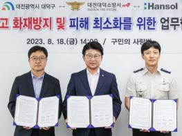 대전 대덕구는 물류창고 화재 방지를 위해 대덕소방서, 한솔제지(주) 대전공장과 18일 구청 구민의사랑방에서 업무협약(MOU)을 체결했다.