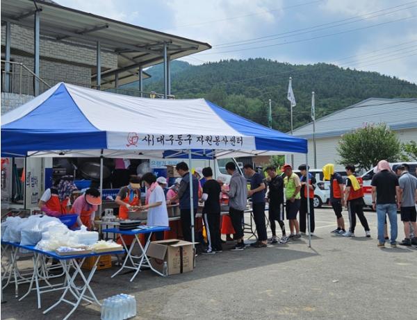 대구동구자원봉사센터와 ‘밥차와 동행하는 이들 봉사단’ 회원 15명은 제6호 태풍 ‘카눈’에 큰 피해를 입은 대구시 군위군을 지원했다.