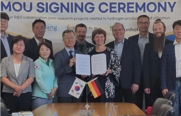 포항시에 따르면 17일(현지 시각) 독일 프라운호퍼 연구소 뮌헨본부에서 포스텍 나노융합기술원과 프라운호퍼 IISB(에를랑겐) 연구소 간 합의각서(MOA) 체결이 이뤄졌다.