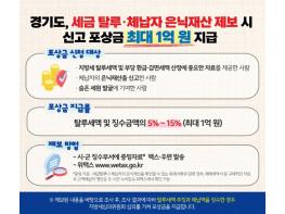 경기도가 탈세 신고포상금을 최대 1억 원까지 지급하는 ‘지방세 탈루 세액·체납자 은닉재산 민간인 신고포상제’를 시행하고 있다며 도민들의 관심과 제보를 요청했다.