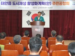 군은 지난 18일 군 교육문화센터 강당에서 가세로 군수를 비롯해 군의원과 지역주민, 용역사 관계자 등 50여 명이 참석한 가운데 ‘태안읍 도시재생 활성화 계획 주민공청회’를 열고 지역 발전을 위한 주민 및 전문가 의견 수렴에 나섰다고 밝혔다.