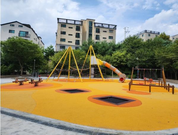 놀이터에는 어린이 신체활동에 도움이 되는 대형 네트 놀이대, 미끄럼틀, 트램펄린(점핑 가능한 그물), 그네 등 놀이기구 5종을 설치했다. 휴게공간을 늘리기 위해 앉음벽(약100m)과 주민들의 체력 증진을 위한 운동기구 5가지도 마련했다.